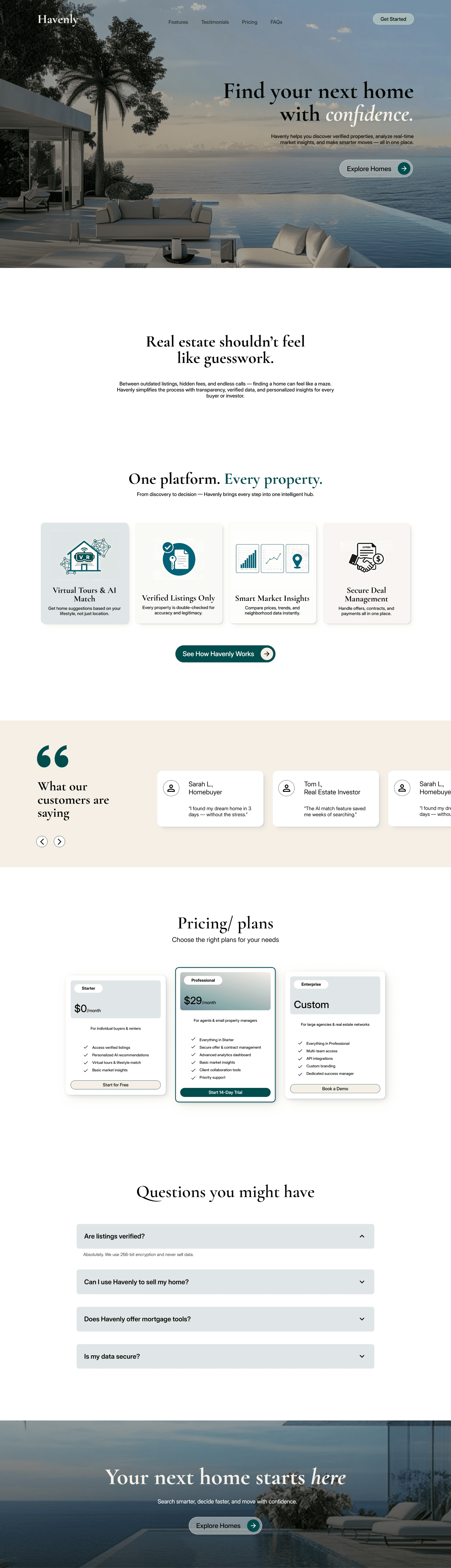 A sophisticated landing page that positions HAVENLY as the trusted platform for confident real estate decisions—designed to convert browsers into registered users and paying customers